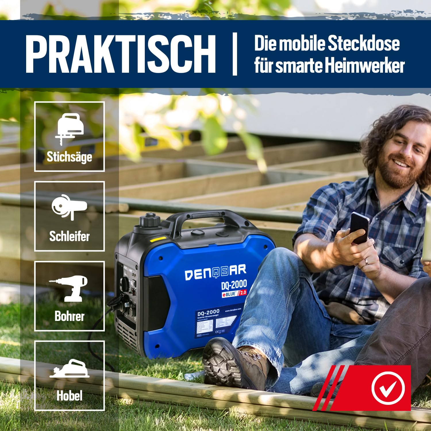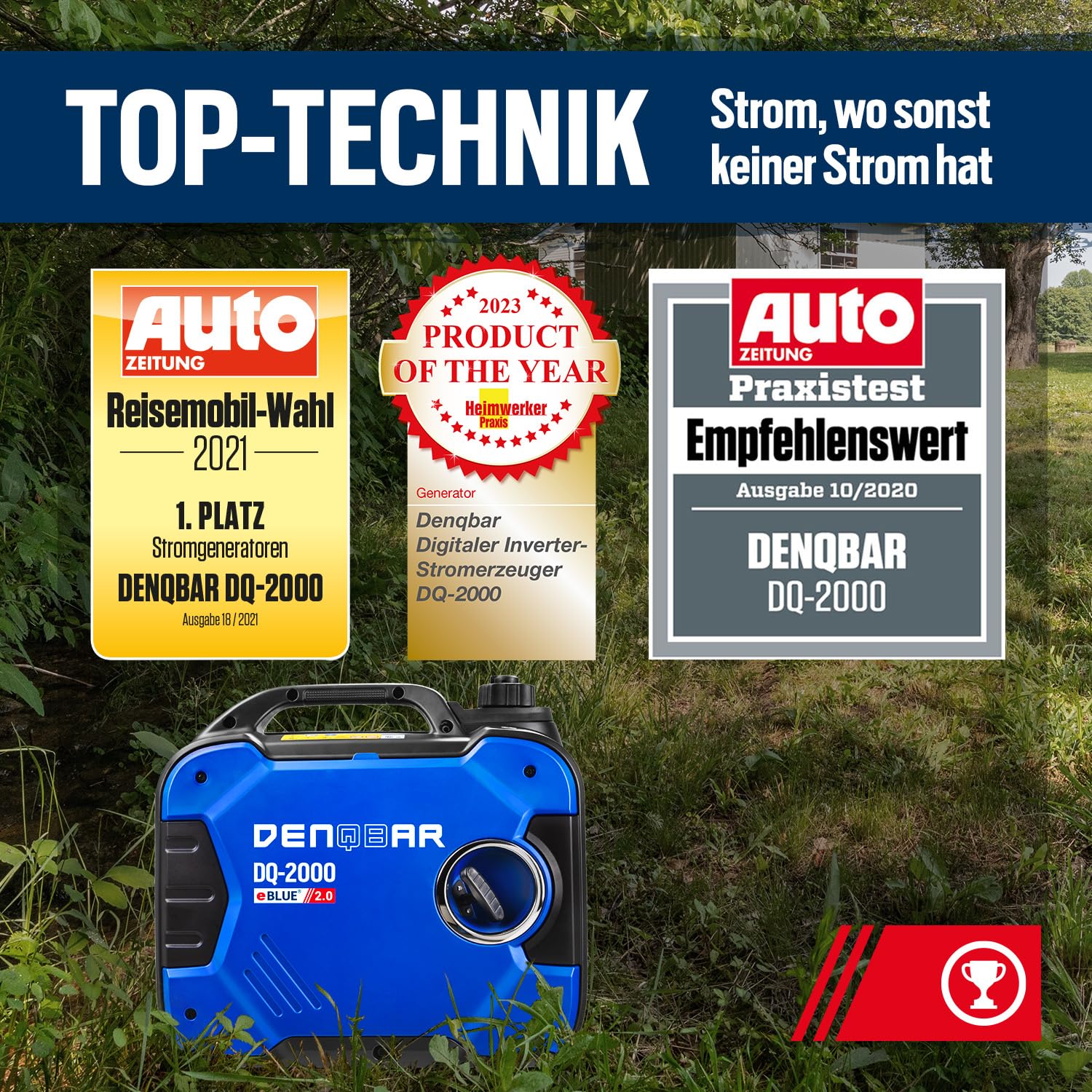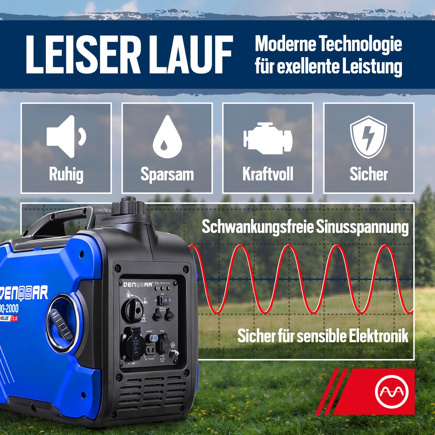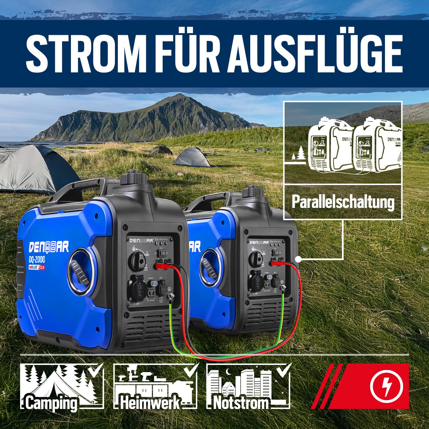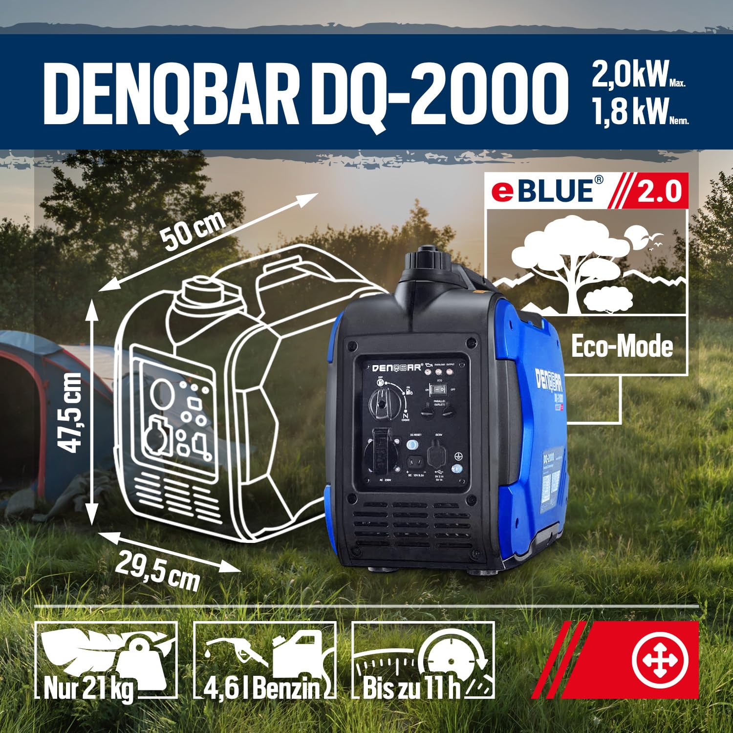 • SAUBERER STROM: Der Inverter Generator DQ-2000 sorgt durch die eBLUE 2.0-Technologie und die gekapselte Bauweise für einen superleisen Betrieb und im Öko-Modus für weniger Benzin-Verbrauch.