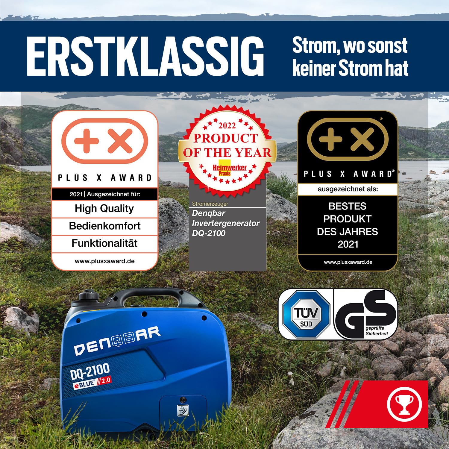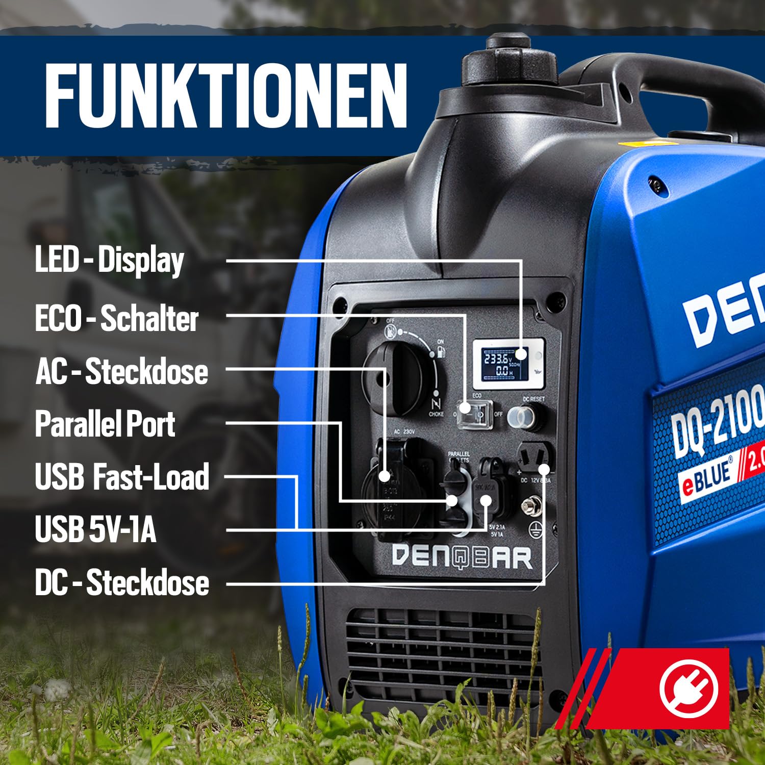 • SAUBERER STROM: Der Inverter Generator DQ-2100 sorgt durch die eBLUE 2.0-Technologie und die gekapselte Bauweise für einen superleisen Betrieb und im Öko-Modus für weniger Benzin-Verbrauch.