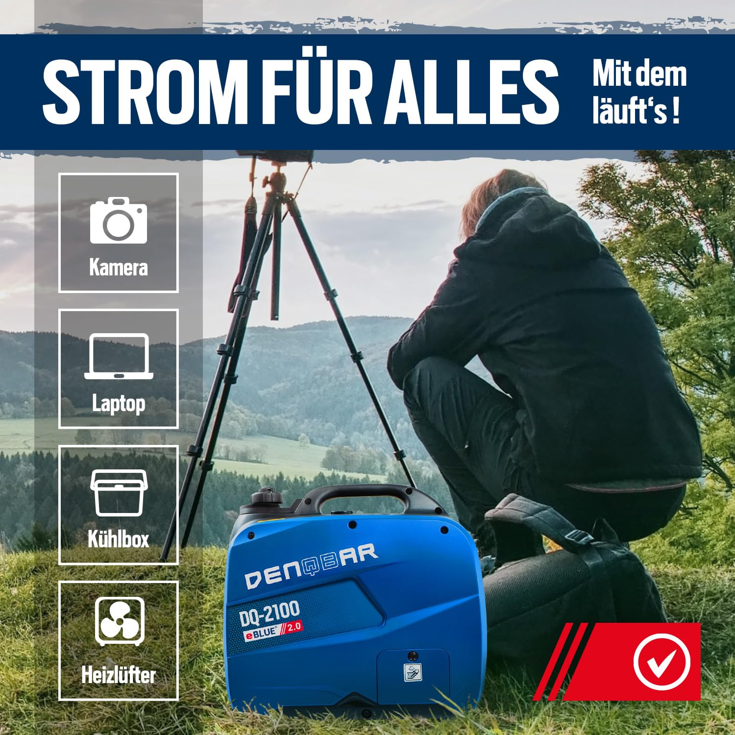 DENQBAR Inverter Stromgenerator DQ-2100 2100W, Benzin Stromerzeuger mit 230V, USB Fast-Load, Superleise, LED Display, tragbar - Für Camping, Outdoor, Baustelle, Reise, Wohnmobil und Notstromaggregat
