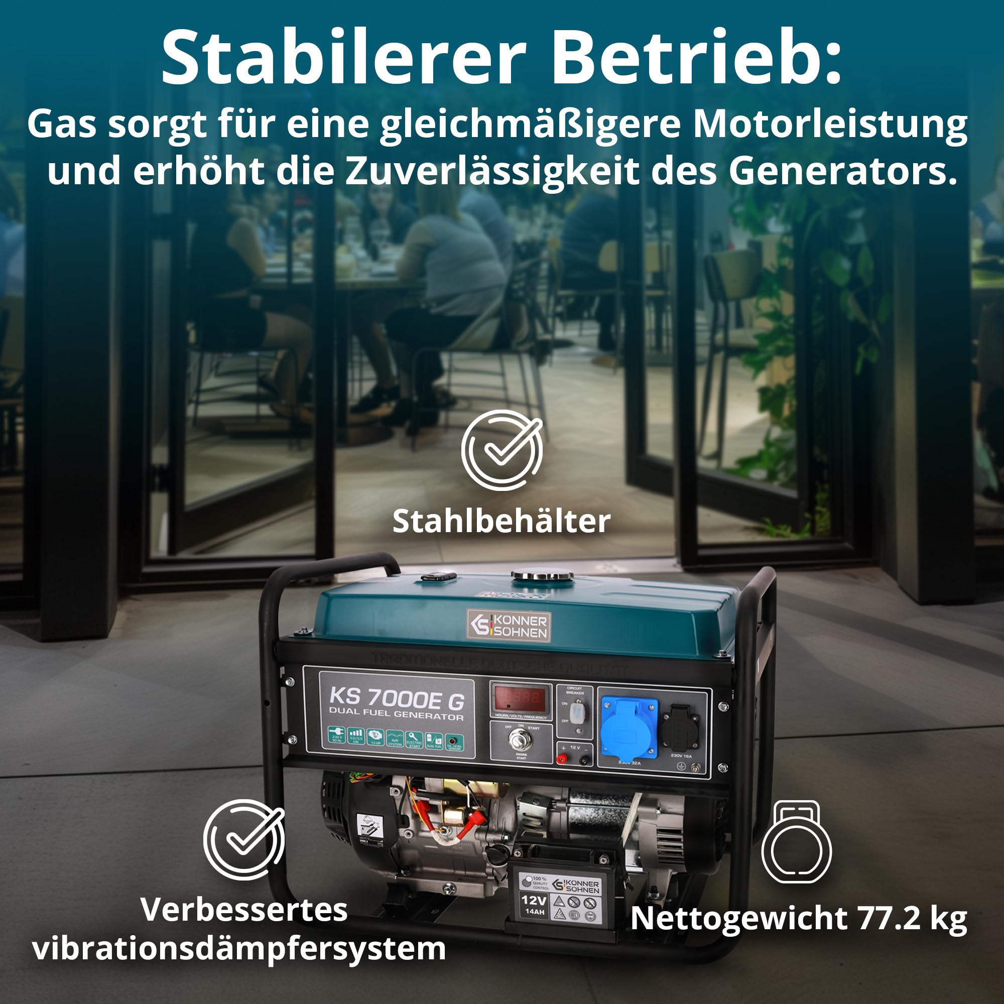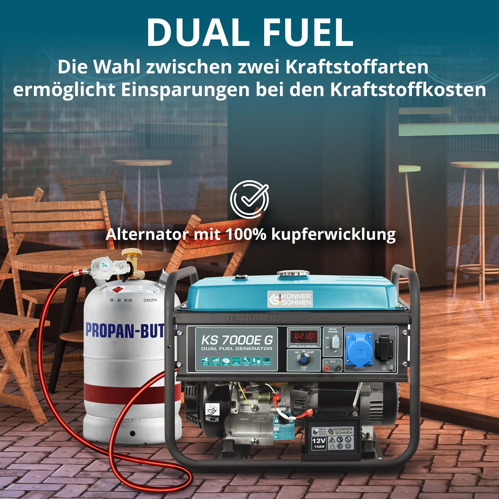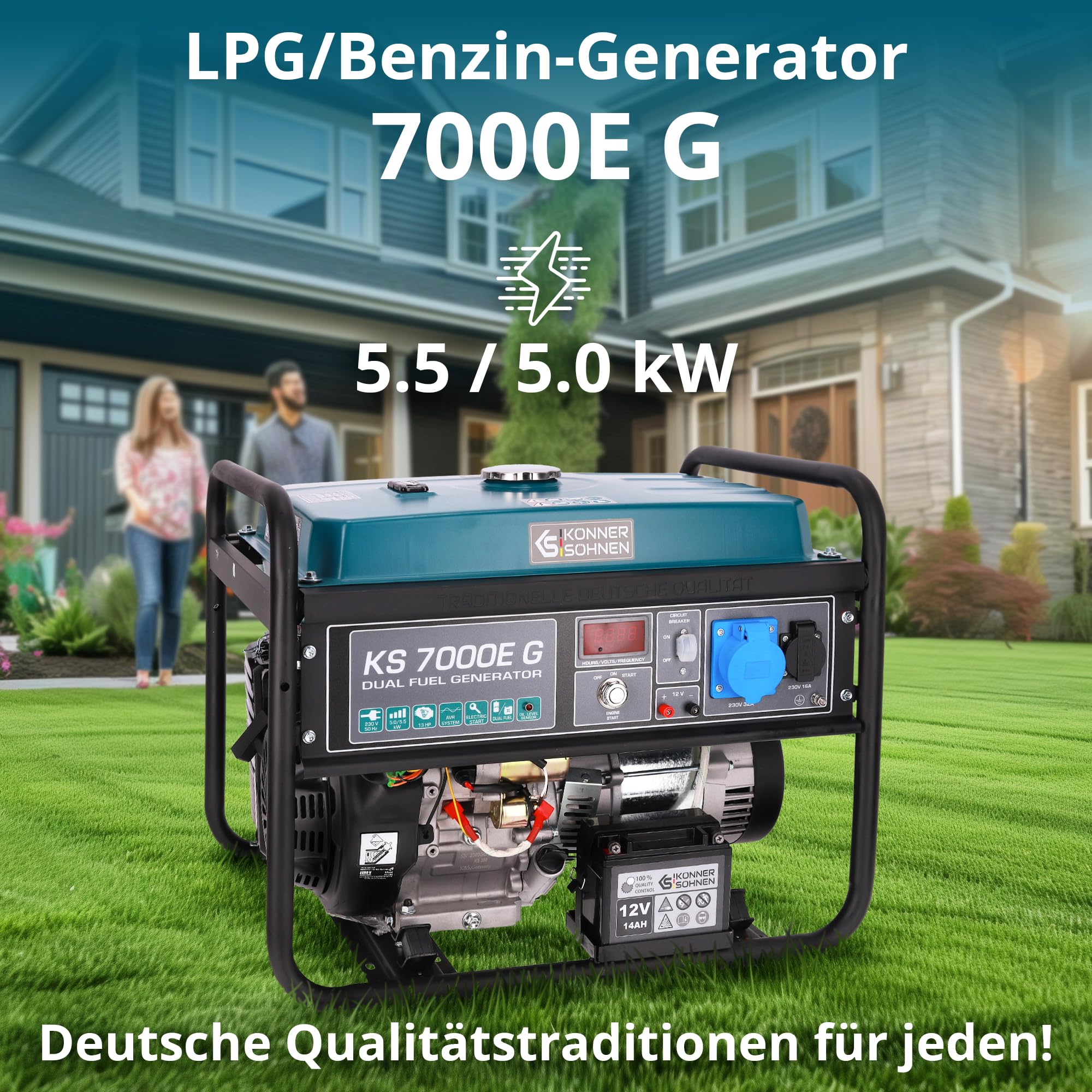 Könner & Söhnen KS 7000E G - Hybrid Benzin-LPG 4-Takt Stromerzeuger,Kupfer Generatoren 5500 Watt,1x16A,1x32A,E-Start, Automatischer Spannungsregler 230V Generator für Haus,Garage oder Werkstatt