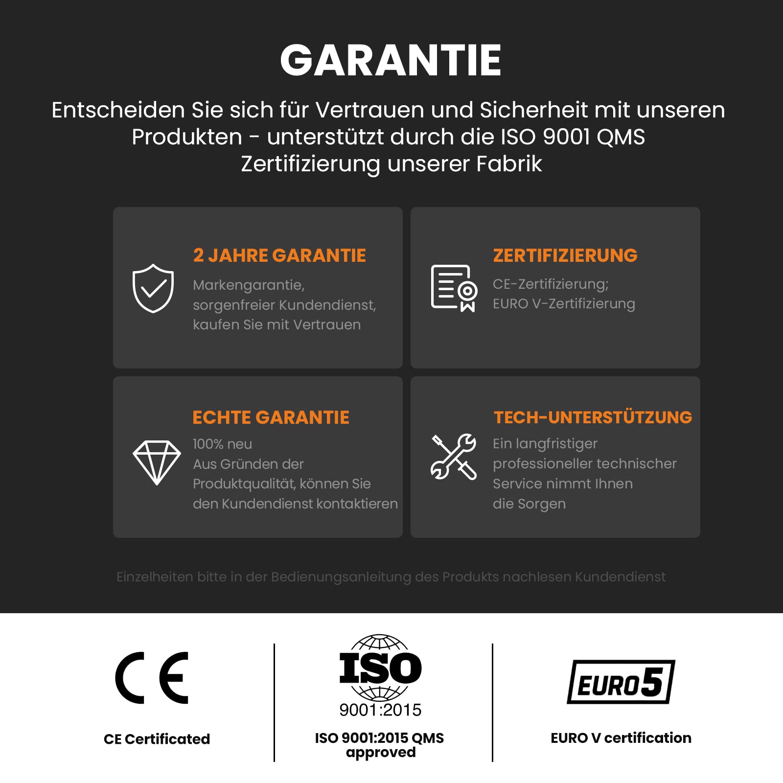 • 【Markengarantie】Maxpeedingrods garantiert alle Inverter-Generatoren gegen Verarbeitungsfehler bei normalem Gebrauch für einen Zeitraum von 2 Jahren ab dem Datum des Einzelhandelskaufs durch den ursprünglichen Endbenutzer ("Garantiezeitraum") sowie lebenslangen kostenlosen technischen Support und Kundendienst.
